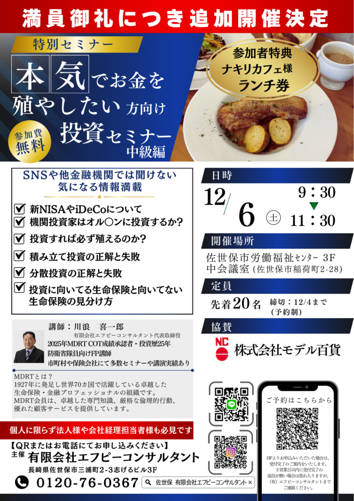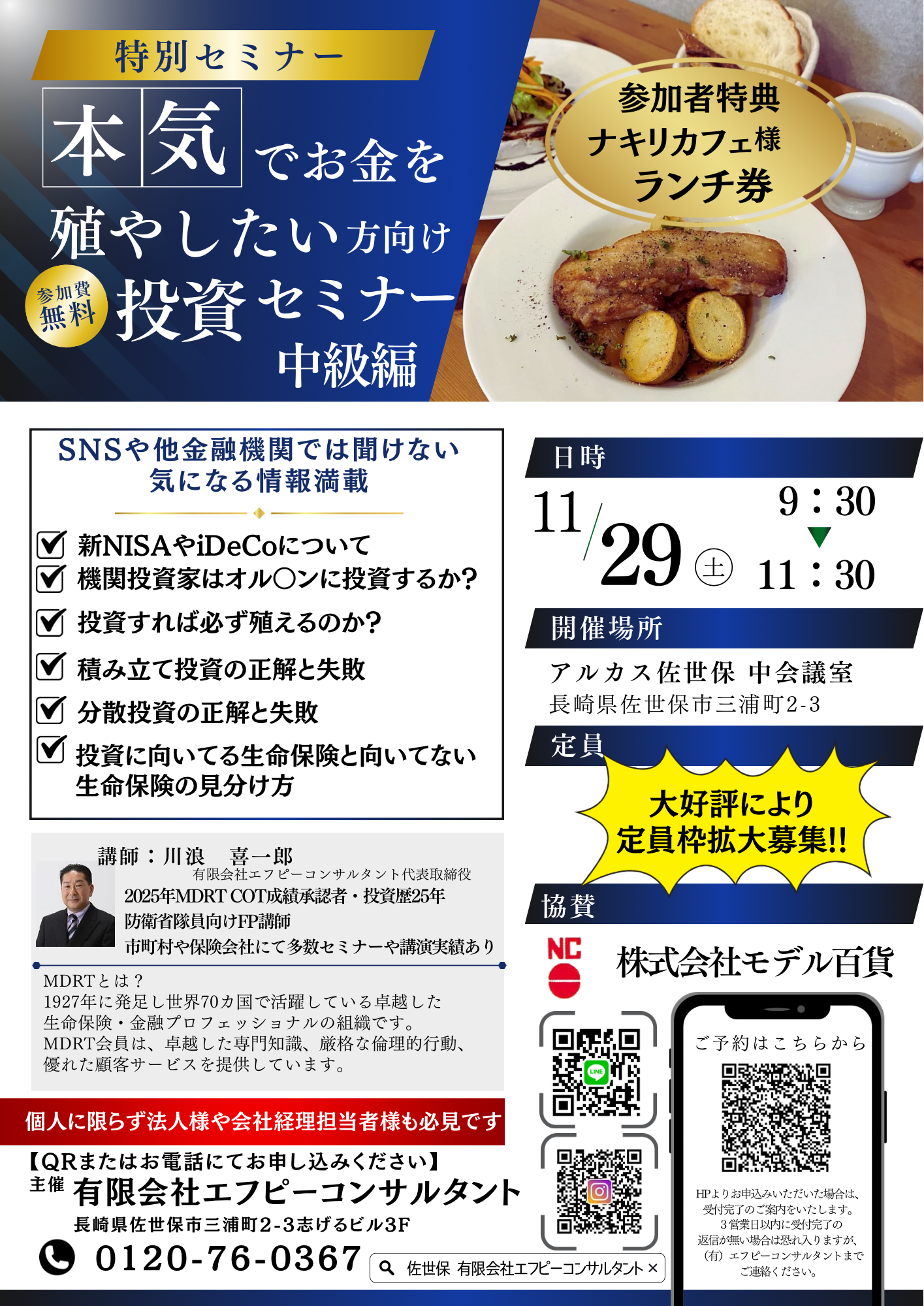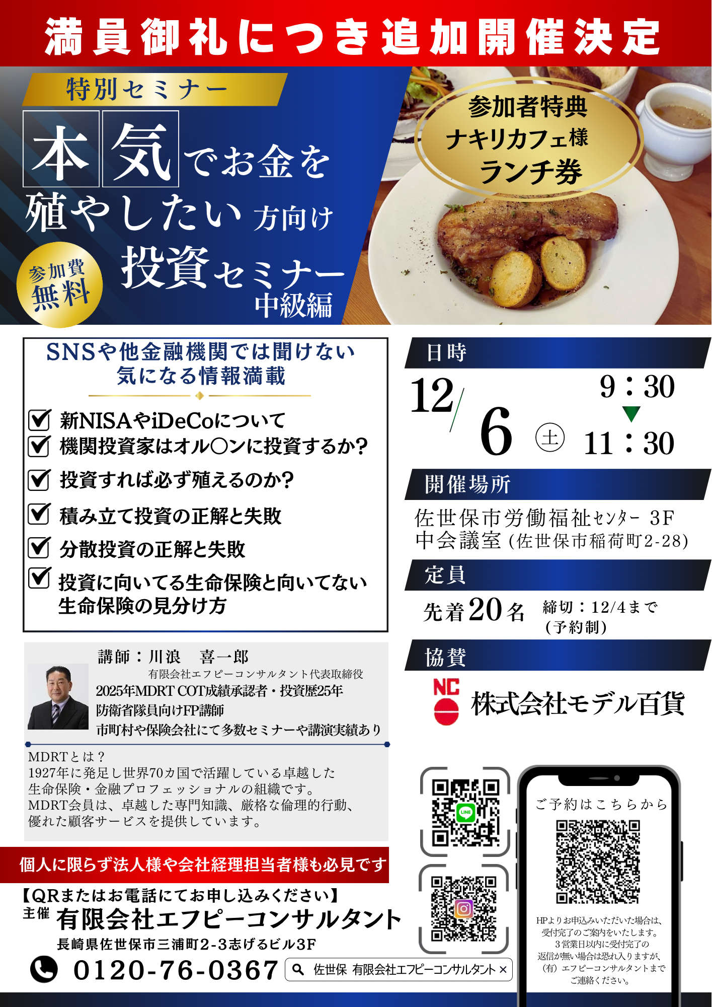 本気でお金を殖やしたい方向け投資セミナー【12/6開催】 2025年10月15日 最終更新日時 : 2025年11月19日 FPconsultant \満員御礼につき追加開催/ お申込内容を送信していただくと、弊社より受付メールが届きます。届かない方はお手数ですが、 LINE又はお電話にてお問い合わせ下さい。 ご予約はこちら(LINE・お電話でもOK) 必須現在、有限会社エフピーコンサルタントで契約いただいていますか? はいいいえ 任意会社名(法人の方) 必須お名前 必須お名前ふりがな 必須生年月日 必須メールアドレス 必須住所 必須電話番号 必須参加ご希望セミナー —以下から選択してください—【募集中】本気でお金を殖やしたい方向け投資セミナー【限定募集】法人用既契約者様向けセミナー【募集中】わかりやすい投資セミナー初級編豊かな人生を送るライフプランニングセミナーHAPPYリタイアメントセミナーパパママのための貯蓄力アップマネーセミナー女性の為のお金のそなえセミナー既契約者様限定特別投資セミナー快適な生活を送るための投資セミナー住宅購入支援セミナー退職予定者向けセミナーお金との正しい向き合い方セミナーFP個別相談 必須参加希望日 必須希望時間 午前午後 任意その他 任意メッセージ 必須聴講券持参の確認 事前に送付する聴講券を当日ご持参ください。聴講券が無い場合は本人確認書類で確認させていただきます。 確認しました プライバシーポリシーに同意して送信する