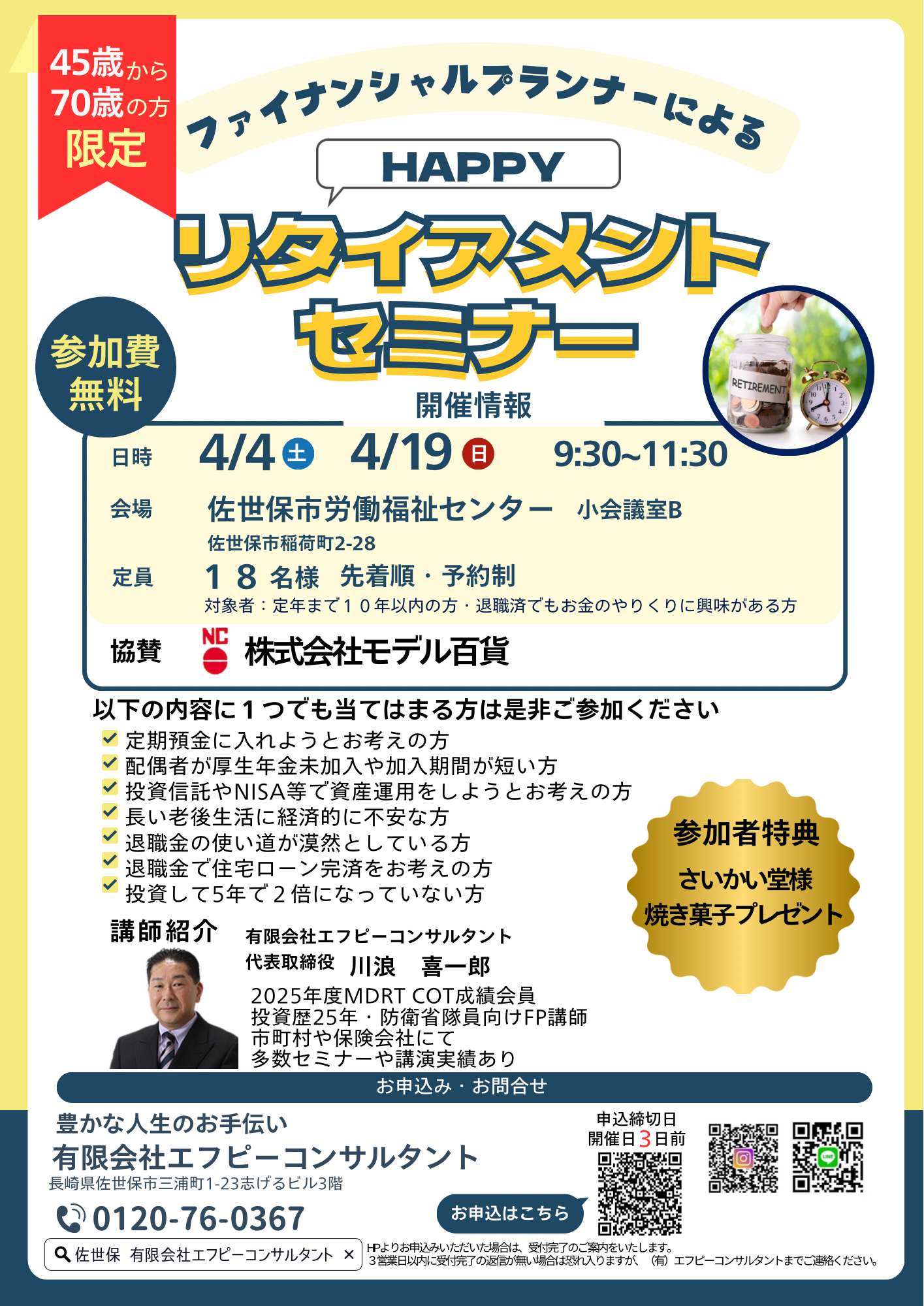ハッピーリタイアメントセミナー【4月4日・19日開催】 2026年1月22日 最終更新日時 : 2026年1月22日 FPconsultant お申込内容を送信していただくと、弊社より受付メールが届きます。届かない方はお手数ですが、 LINE又はお電話にてお問い合わせ下さい。 ご予約はこちら(LINE・お電話でもOK) 必須現在、有限会社エフピーコンサルタントで契約いただいていますか? はいいいえ 任意会社名(法人の方) 必須お名前 必須お名前ふりがな 必須生年月日 必須メールアドレス 必須住所 必須電話番号 必須参加ご希望セミナー —以下から選択してください—【募集中】HAPPYリタイアメントセミナー【募集中】本気でお金を殖やしたい方向け投資セミナー法人用既契約者様向けセミナー【締切間近】わかりやすい投資セミナー初級編豊かな人生を送るライフプランニングセミナーパパママのための貯蓄力アップマネーセミナー女性の為のお金のそなえセミナー既契約者様限定特別投資セミナー快適な生活を送るための投資セミナー住宅購入支援セミナーお金との正しい向き合い方セミナーFP個別相談 必須参加希望日 必須希望時間 午前午後 任意その他 任意メッセージ 必須聴講券持参の確認 事前に送付する聴講券を当日ご持参ください。聴講券が無い場合は本人確認書類で確認させていただきます。 確認しました プライバシーポリシーに同意して送信する
